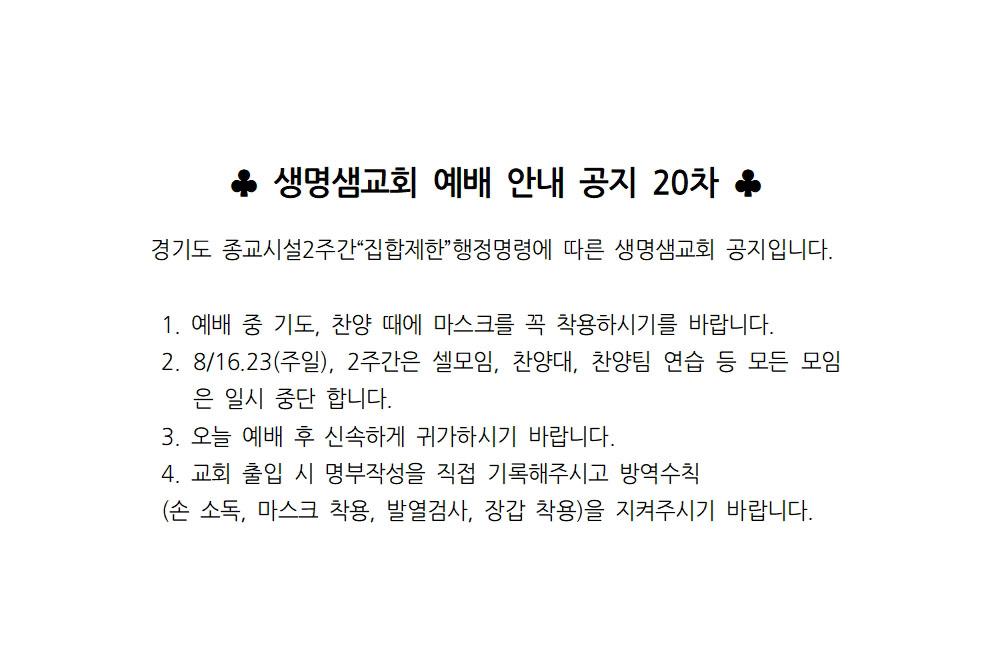 코로나19 생명샘교회 공지 20차